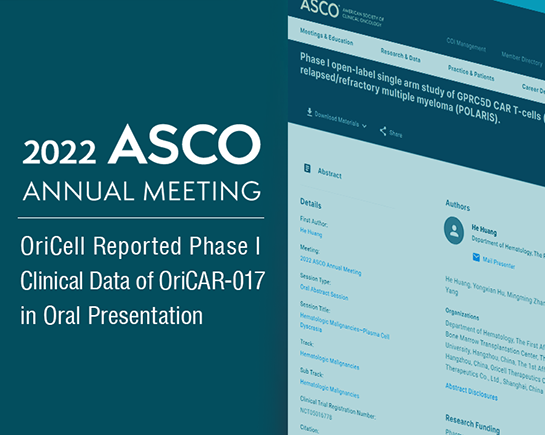 Shanghai, PRC, June 5th, 2022 — OriCell Therapeutics Co., Ltd (OriCell) today reported the positive results from Phase I POLARIS study, an investigator-sponsored study evaluating Ori-CAR017, an autologous GPRC5D-directed CAR-T cell, in patients with relapsed/refractory multiple myeloma at American Society of Clinical Oncology(ASCO) annual meeting.